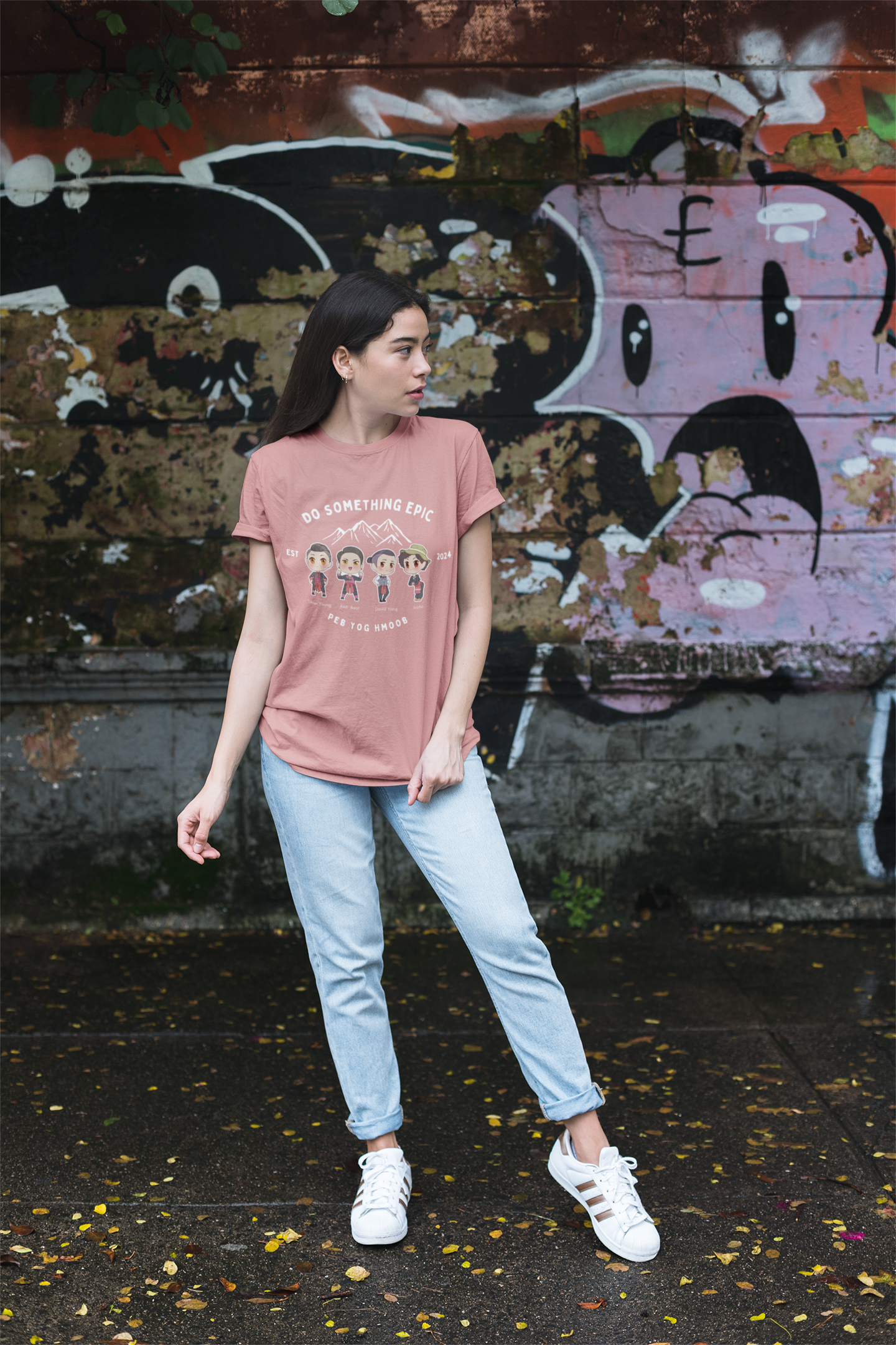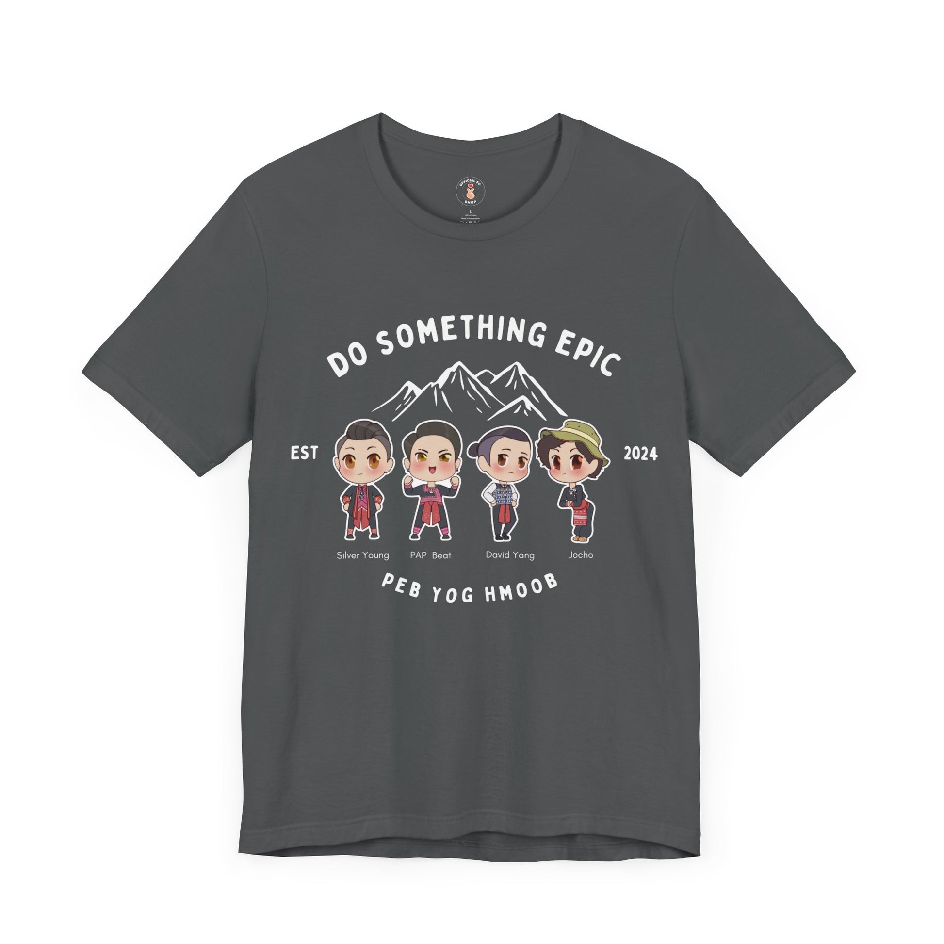 Stand out with our exclusive 2025 collaboration t-shirt featuring the powerful taglines "Do Something Epic" and "Peb Yog Hmoob" (We Are Hmong). This special edition shirt showcases adorable chibi-style illustrations of our featured artists and content creators, each character capturing the unique personality and spirit of our amazing collaborators.